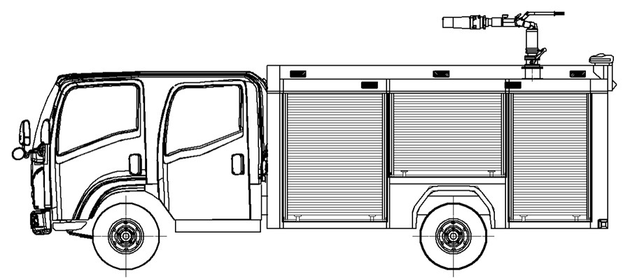 | 總體布置 | 整車由消防員乘員室和車身兩大部分組成,車身布置采用內藏罐式結構,左右兩側為器材箱,中部為水罐,器材箱后部為泵房。 |